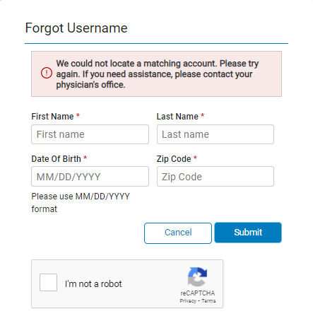 If you need to retrieve your user name or reset your password, follow the instructions below. If these instructions do not resolve the issue or if you have other issues not covered here, contact your practice.