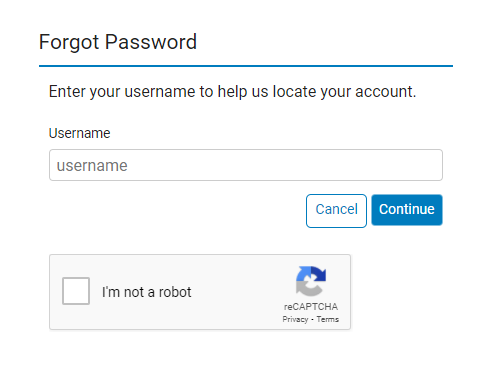 In the next screen, check the box next to "I'm not a robot", and then select Continue. Your username will automatically populate since you entered it in the previous screen.
