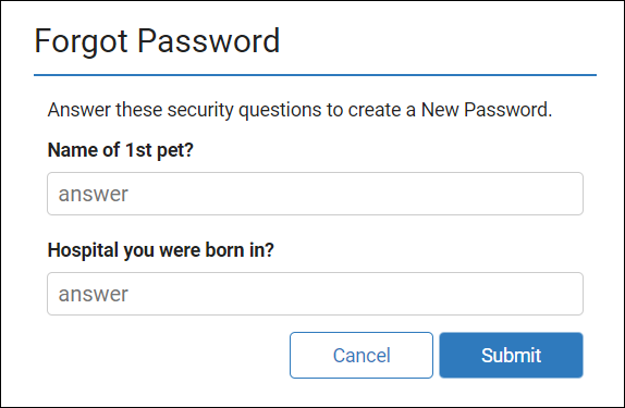 Next, provide the answer to your security questions and then select Submit. If you cannot remember your answers, contact your provider. To learn how to configure your security questions see the My Account Settings topic.