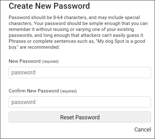 Enter your new password and confirm it. Be sure to follow the following password requirements: