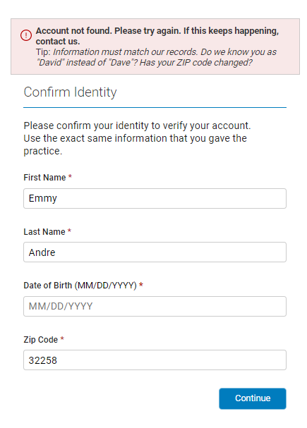 Enter your information in the Identification fields again and then select Continue. If you continue to have difficulty, contact your provider.