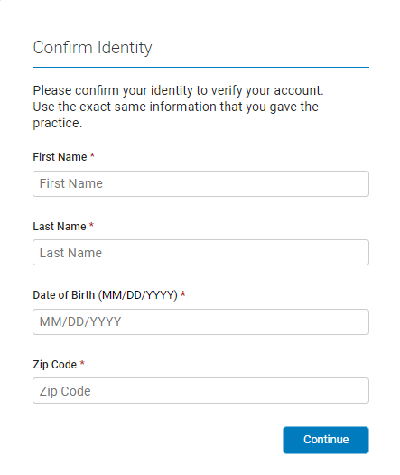 After selecting the registration email, you will see the Identification page. Here, you identify yourself by providing the exact information that you gave to your practice (First and Last Name, Date of Birth, and Zip Code). Select Continue when finished.