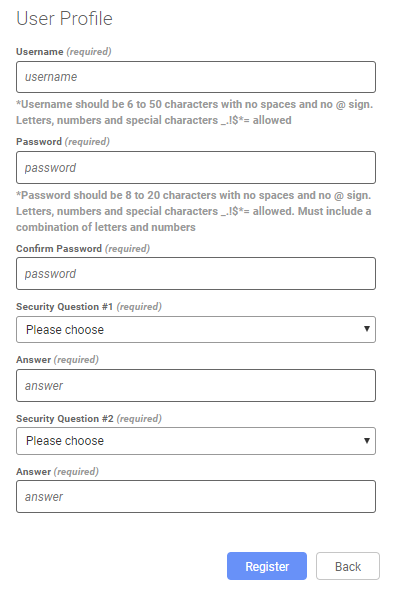After you are finished filling in the information in the Identification page, you will then see the User Profile page. Here you will be able to set your username, password, and set your security questions (you'll have to answer these if you forget your password). Select Register when complete.