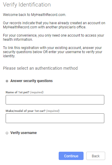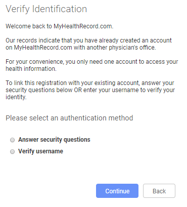 If you see the Verify Identification page rather than the Patient Profile page it means that you already have an account with MyHealthRecord.com with another physician's office. Since you will only need one account to access your health information from more than one provider, you can link your new registration with your existing account.